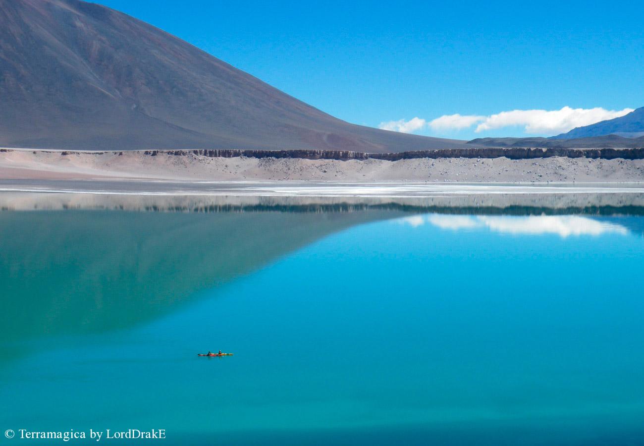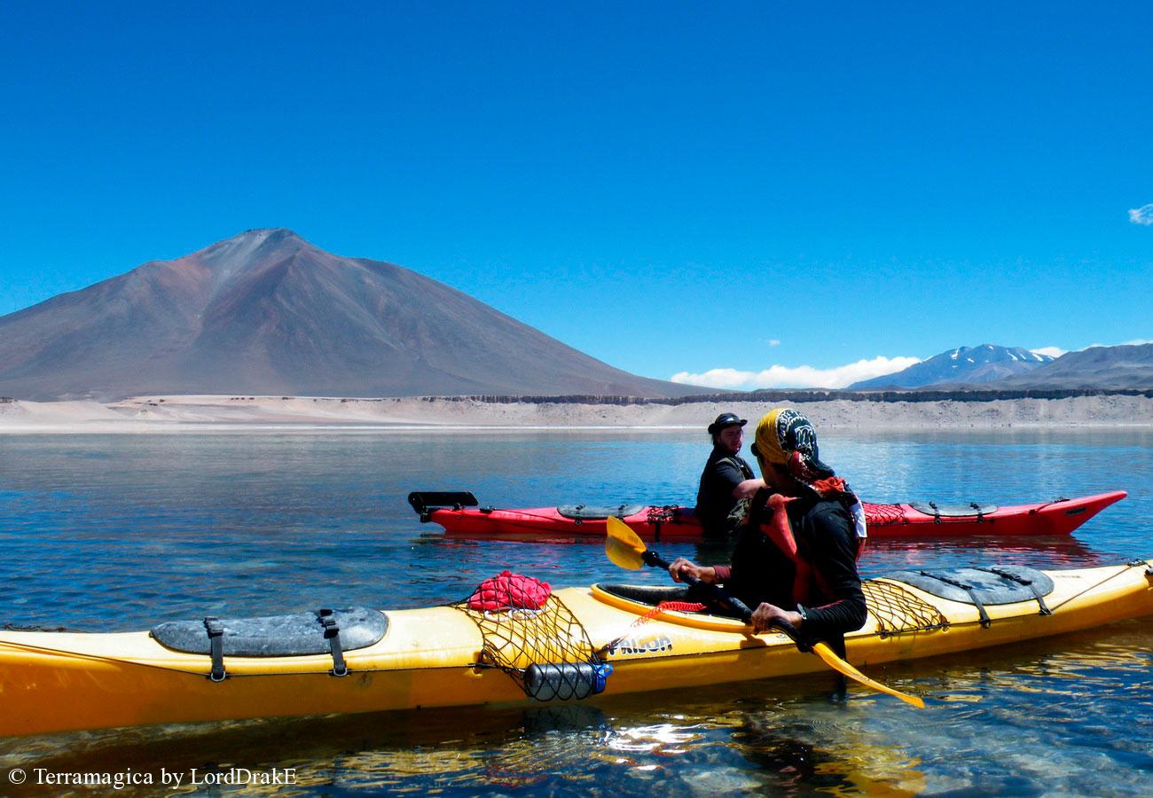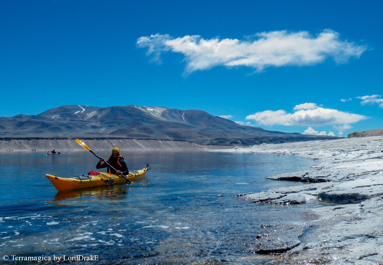 A orillas de nuestro campamento base, cercano a una zona de aguas termales, lanzamos nuestros kayak a las transparentes aguas de esta laguna turquesa, y lentamente nos fuimos deslizando en nuestros kayaks, rodeado de un exuberante y surrealista paisaje desertico, pero lleno de colores. La carencia de oxígeno se hace sentir al estar a 4350msnm, y debemos remar lentamente, las cristalinas aguas estan a muy baja temperatura y el agua esta saturada de minerales, los cuales le otorgan un sabor bastante salado.