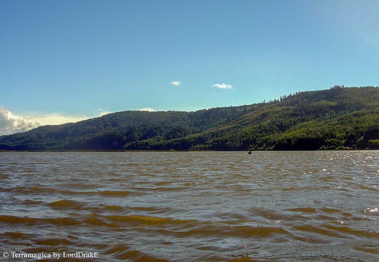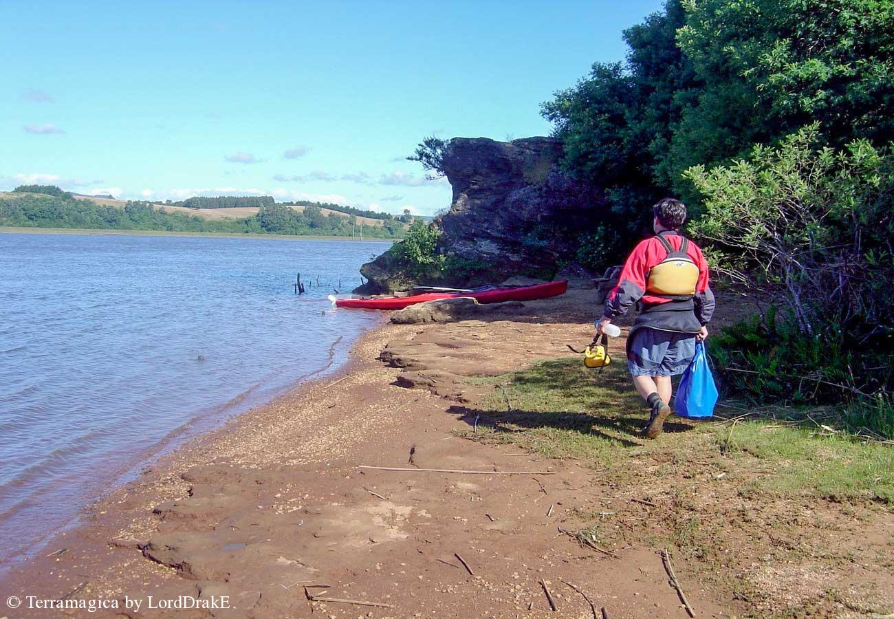 El Kayak responde bien y  pronto nos encontramos navegando en medio del maravilloso Santuario de la Naturaleza Carlos Anwandter, tuvimos que detenernos en una pequeña playa para ajustar el timón que se había descalibrado, pero todo fue solucionado en un par de minutos, y al agua nuevamente. Remar y remar a través de estos parajes es realmente un placer, estamos contemplando los efectos del terremoto del año 60 que inundo mucho el terreno que ahora justamente navegamos. Continuamos remando con algunos cisnes de cuello negro como escoltas, y pronto entramos al río Cisnes, en donde se hace sentir el cambio de aguas, y el medio se torna un poco mas agitado, un sin numero de aves acuáticas pululan en las riberas.